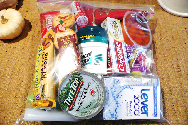 Assemble all the items in the bags, and maybe throw in a note of encouragement. Seal the bags and stow in your car for a moment of providence.